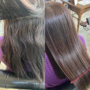 髪質改善とは髪の毛のダメージ、うねり、ぱさつきを改善し、手触りやツヤを良くする施術です。